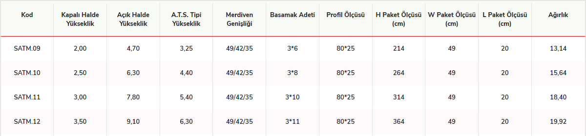 Ürün Özellikleri Al 6063 serisinden üretilip 65 brinel sertlik derecesindedir. Taşıyıcı profil ölçüleri: 80×25 mm (STM.11) Basamak profil ölçüleri: 30×30 mm kaymaz desenli kare basamak profili Merdiven genişliği 49/42/35 cm’dir. Taşıma kapasitesi maksimum 150 Kg. Kaymayı önleyici ayaklar. Kullanım Alanları Dış ve iç cephe, tabelacılar, elektrikçiler, endüstriyel temizlik, telekomcular gibi birçok sektörde kullanıma Kod SATM.11 Kapalı Halde Yükseklik 3,00 Açık Halde Yükseklik 7,80 A.T.S. Tipi Yükseklik 5,40 Merdiven Genişliği 49/42/35 Basamak Adeti 3×10 Profil Ölçüsü 80×25 H Paket Ölçüsü 314 (cm)W Paket Ölçüsü 49 (cm)L Paket Ölçüsü 20 (cm) 18,40 Ağırlık