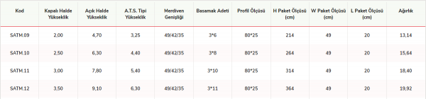 Ürün Özellikleri Al 6063 serisinden üretilip 65 brinel sertlik derecesindedir. Taşıyıcı profil ölçüleri: 80×25 mm (STM.11) Basamak profil ölçüleri: 30×30 mm kaymaz desenli kare basamak profili Merdiven genişliği 49/42/35 cm’dir. Taşıma kapasitesi maksimum 150 Kg. Kaymayı önleyici ayaklar. Kullanım Alanları Dış ve iç cephe, tabelacılar, elektrikçiler, endüstriyel temizlik, telekomcular gibi birçok sektörde kullanıma Kod SATM.11 Kapalı Halde Yükseklik 3,00 Açık Halde Yükseklik 7,80 A.T.S. Tipi Yükseklik 5,40 Merdiven Genişliği 49/42/35 Basamak Adeti 3×10 Profil Ölçüsü 80×25 H Paket Ölçüsü 314 (cm)W Paket Ölçüsü 49 (cm)L Paket Ölçüsü 20 (cm) 18,40 Ağırlık
