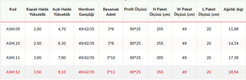 Ürün Özellikleri Al 6063 serisinden üretilip 65 brinel sertlik derecesindedir. Taşıyıcı profil ölçüleri: 80X25 mm (ASM.11) Basamak profil ölçüleri: 30×30 mm kaymaz desenli kare basamak profili Merdiven genişliği 49/42/35 cm’dir. Taşıma kapasitesi maksimum 150 Kg. Kaymayı önleyici ayaklar. Kullanım Alanları Dış ve iç cephe, tabelacılar, elektrikçiler, endüstriyel temizlik, telekomcular gibi birçok sektörde kullanıma Kod ASM.11 Kapalı Halde Yükseklik 3,00 Açık Halde Yükseklik 7,80 A.T.S. Tipi Yükseklik Merdiven Genişliği 49/42/35 Basamak Adeti 3×10 Profil Ölçüsü 80×25 H Paket Ölçüsü 305 (cm)W Paket Ölçüsü 49 (cm)L Paket Ölçüsü 20 (cm) 17,38 Ağırlık