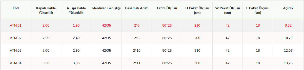Ürün Özellikleri Al 6063 serisinden üretilip 65 brinel sertlik derecesindedir. Taşıyıcı profil ölçüleri: 80×25 mm (ATM.03) Basamak profil ölçüleri: 30×30 mm kaymaz desenli kare basamak profili Merdiven genişliği 42/35 cm’dir. Taşıma kapasitesi maksimum 150 Kg. Kaymayı önleyici ayaklar. Kullanım Alanları Dış ve iç cephe, tabelacılar, elektrikçiler, endüstriyel temizlik, telekomcular gibi birçok sektörde kullanıma Kod ATM.03 Kapalı Halde Yükseklik 3,00 Açık Halde Yükseklik 3,35 A.T.S. Tipi Yükseklik Merdiven Genişliği 42/35 Basamak Adeti 2×10 Profil Ölçüsü 80×25 H Paket Ölçüsü 310 (cm)W Paket Ölçüsü 42 (cm)L Paket Ölçüsü 18 (cm) 12,06 Ağırlık