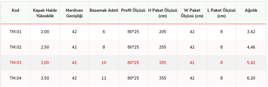Ürün Özellikleri Al 6063 serisinden üretilip 65 brinel sertlik derecesindedir. Taşıyıcı profil ölçüleri: 80×25 mm (TM.04) Basamak profil ölçüleri: 30×30 mm kaymaz desenli kare basamak profili Merdiven genişliği 42 cm’dir. Taşıma kapasitesi maksimum 150 Kg. Kaymayı önleyici ayaklar. Kullanım Alanları Dış ve iç cephe, tabelacılar, elektrikçiler, endüstriyel temizlik, telekomcular gibi birçok sektörde kullanıma Kod TM.04 Kapalı Halde Yükseklik 3,50 Merdiven Genişliği 42 Basamak Adeti 11 Profil Ölçüsü 80×25 H Paket Ölçüsü 355 (cm)W Paket Ölçüsü 42 (cm)L Paket Ölçüsü 8 (cm) 6,20 Ağırlık